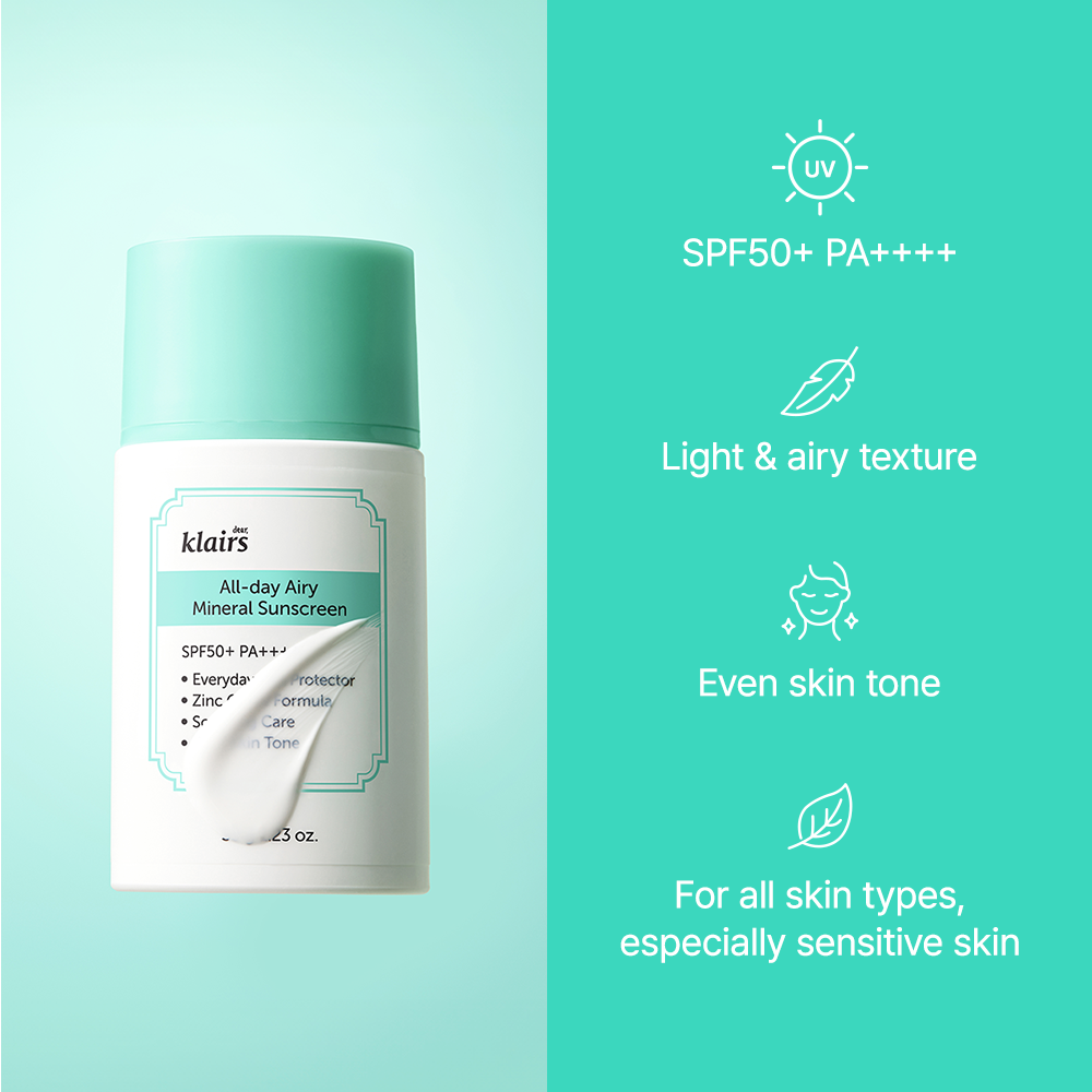No.1 selling SPF, All-day Airy Sunscreen? Now you can meet Klairs All-day Airy Mineral Sunscreen! Embrace the sun with SPF 50+ PA++++ protection that feels light on your skin yet offers heavy-duty UV protection.