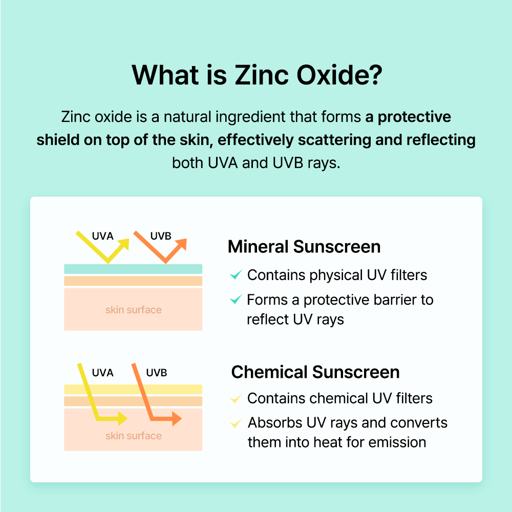 *Zinc Oxide?: Zinc oxide is a natural ingredient that forms a protective shield on top of the skin, effectively scattering and reflecting both UVA and UVB rays.