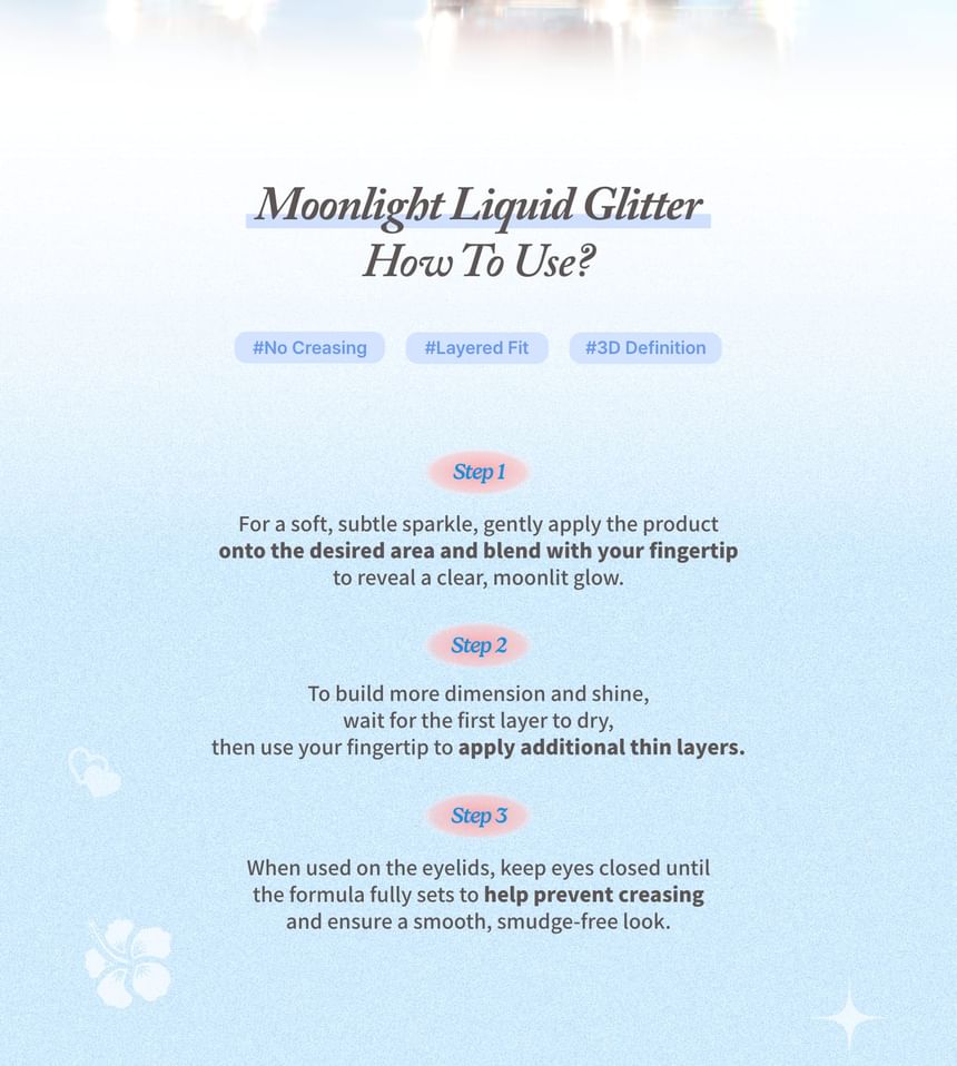 Apply directly onto eyelids using the applicator tip, then gently blend with your fingertip or an eyeshadow brush for a seamless sparkle.