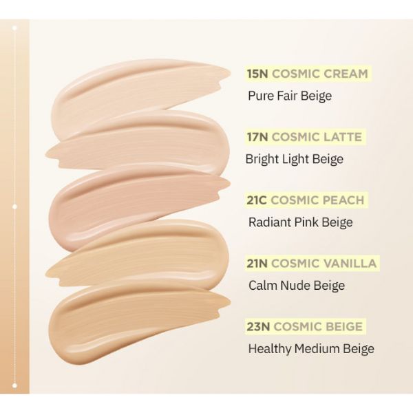 21N Cosmic Vanilla /Water,Titanium Dioxide (CI 77891),Cetyl Ethylhexanoate,Methyl Trimethicone,PentaerythritylTetraethylhexanoate,Lauryl Polyglyceryl-3 PolydimethylsiloxyethylDimethicone,Isododecane,Polymethylsilsesquioxane,Caprylyl Methicone,PhenylTrimethicone,Propanediol,Synthetic Fluorphlogopite,Polyglyceryl-4Isostearate,Glycerin,Niacinamide,Trimethylsiloxysilicate,1,2-Hexanediol,Iron Oxides (CI 77492),CamelliaJaponica Flower Extract,Helianthus Annuus (Sunflower) Seed Oil,Bacillus Ferment,LactobacillusFerment,Malachite Extract,Acrylates/Polytrimethylsiloxymethacrylate Copolymer,VP/HexadeceneCopolymer,Silica,Disteardimonium Hectorite,Magnesium Sulfate,Octyldodecanol,Acrylates/DimethiconeCopolymer,Stearic Acid,Triethoxycaprylylsilane,Alumina,Aluminum Hydroxide,ButyleneGlycol,Polyhydroxystearic Acid,Boron Nitride,Adenosine,Ethylhexyl Palmitate,Isopropyl Myristate,IsostearicAcid,Lecithin,Trisodium Ethylenediamine Disuccinate,Methicone,Isopropyl TitaniumTriisostearate,Polyglyceryl-3 Polyricinoleate,Tocopherol,Sucrose,Ethylhexylglycerin,DisodiumEDTA,Fragrance(Parfum),Iron Oxides (CI 77491),Iron Oxides (CI 77499),Manganese Violet (CI77742),Chromium Oxide Greens (CI 77288),Ultramarines (CI 77007)