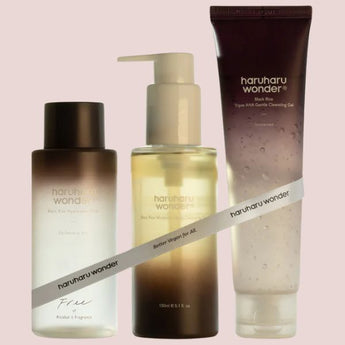 HARUHARU WONDER Cleanse & Glow Set: Black Rice Hyaluronic Toner For Sensitive Skin 150ml, Black Rice Moisture Deep Cleansing Oil 150ml, Black Rice Triple AHA Gentle Cleansing Gel Unscented 100ml (Full Size Products)