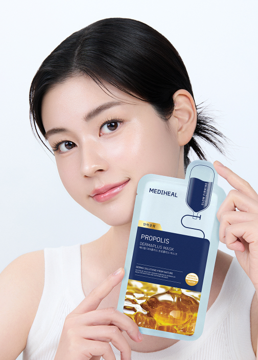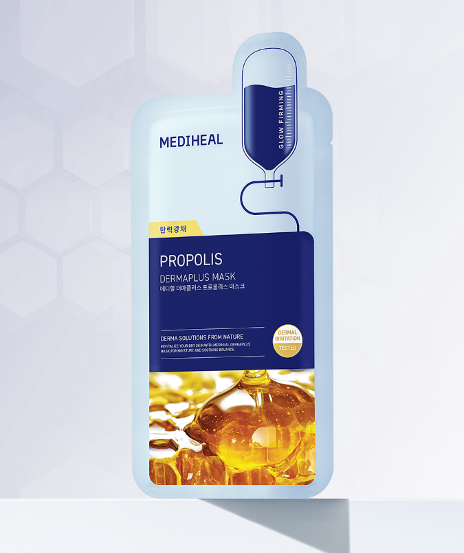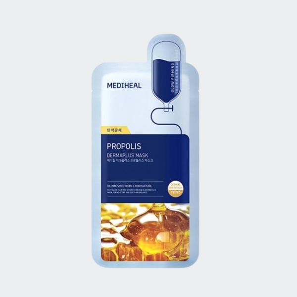 The MEDIHEAL Derma Plus Propolis Mask is a skincare sheet mask with natural propolis extract, designed to deliver hydration, nourishment, and firming effects.