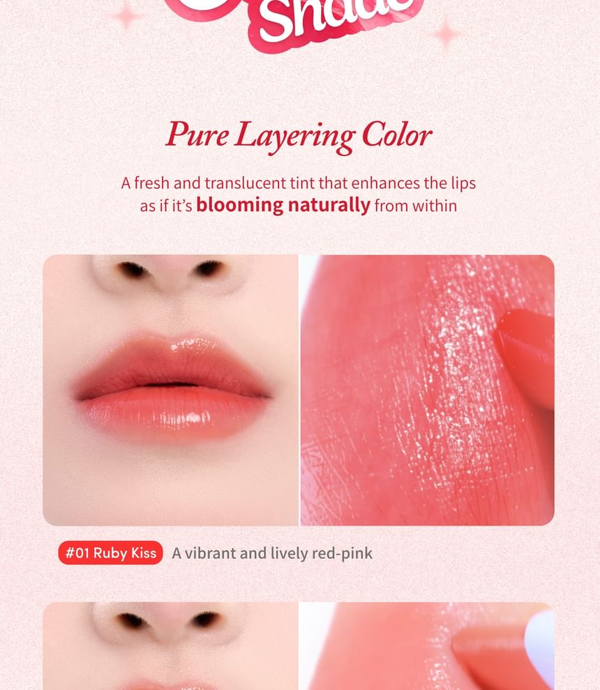01 Ruby Kiss – Bright and lively red-pink for an effortlessly bold look.
