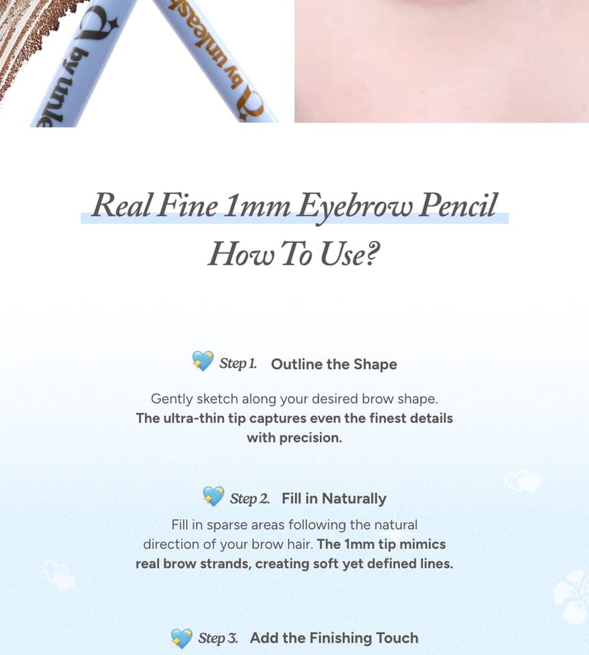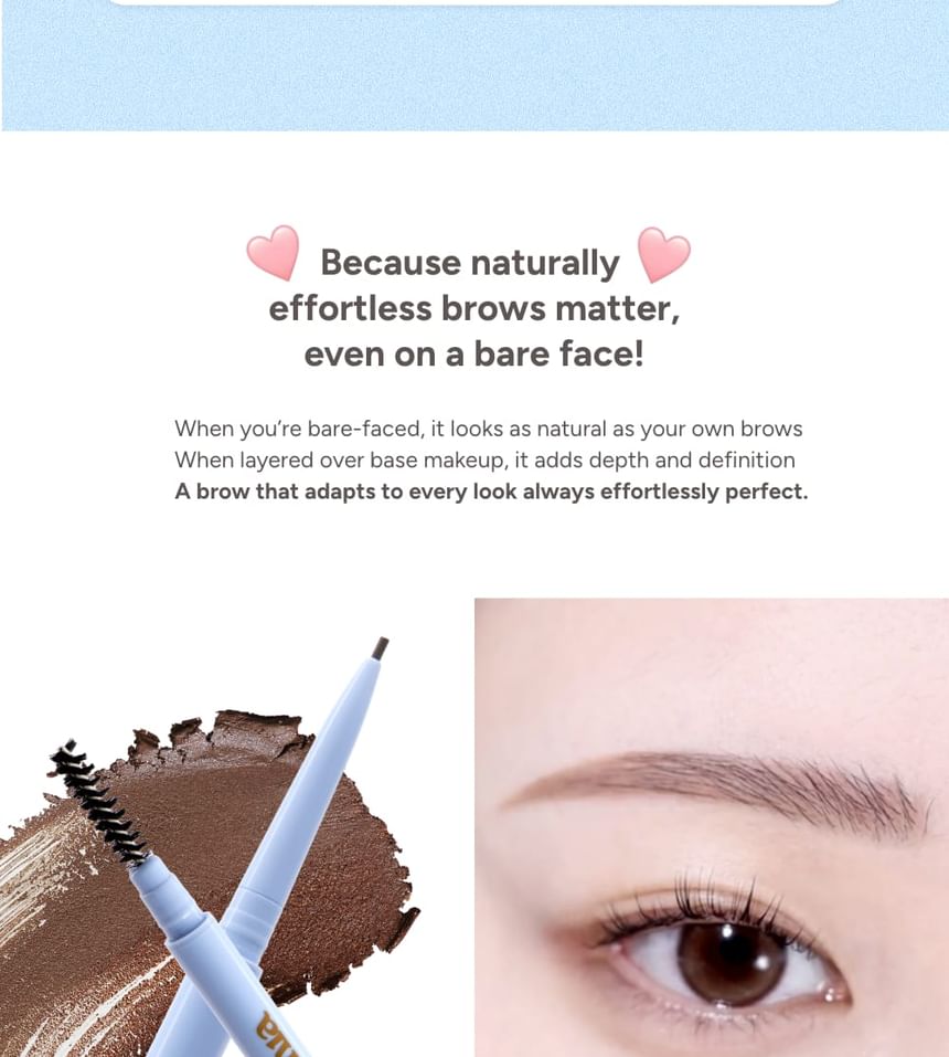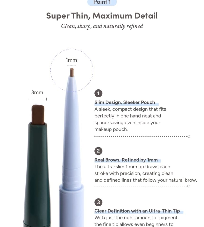 Achieve perfectly defined, natural-looking brows with this ultra-slim eyebrow pencil featuring a 1mm precision tip. Its smooth texture glides effortlessly to mimic real brow hairs, while the smudge-proof formula ensures long-lasting wear without clumping or fading.
