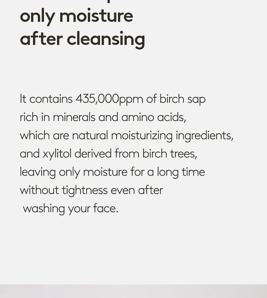 Betula Platyphylla Japonica Juice, Water, Glycerin, Coco-Betaine, Potassium Cocoyl Glycinate, Disodium Cocoamphodiacetate, Sucrose, Sodium Chloride, Coco-Glucoside, Aspartic Acid, Citrus Aurantium Bergamia (Bergamot) Fruit Oil, Glyceryl Oleate, PEG-7 Glyceryl Cocoate, Glyceryl Caprylate, Caprylyl Glycol, Sodium Cocoyl Isethionate, Disodium EDTA, 1,2-Hexanediol, Quillaja Saponaria Bark Extract, Camellia Sinensis Leaf Extract, Maltodextrin, Moringa Pterygosperma Seed Extract, Butylene Glycol, Xylitylglucoside, Anhydroxylitol, Propanediol, Caprylic/Capric Triglyceride, Xylitol, Phospholipids, Lactobacillus Ferment, Lactococcus Ferment Lysate, Ceramide 3, Phenoxyethanol, Plankton Extract, Asparagus Officinalis Stem Extract, Bifida Ferment Lysate, Saponaria Officinalis Leaf Extract, Streptococcus Thermophilus Ferment, Calcium Gluconate, Cholesterol, Gluconolactone, Potassium Sorbate, Sodium Benzoate, Ethylhexylglycerin, Arginine, Phytosterols