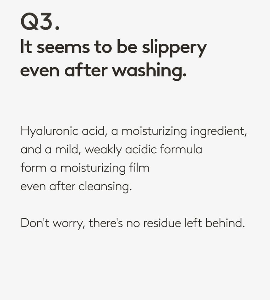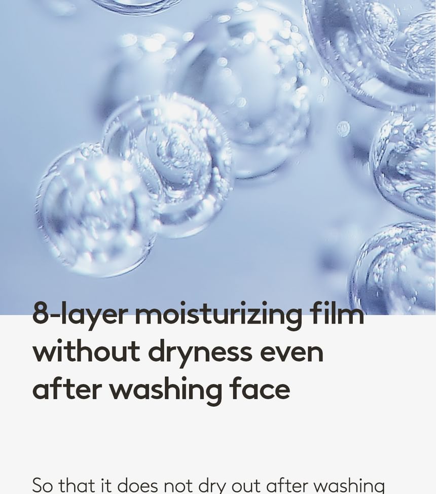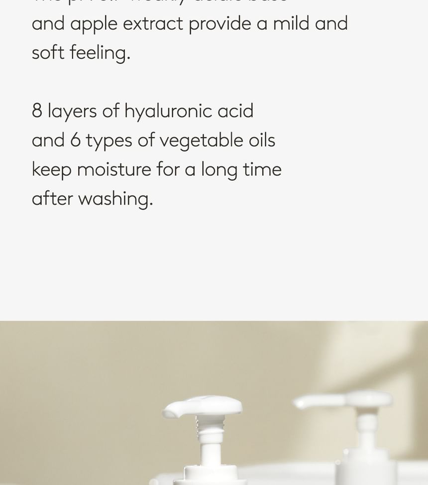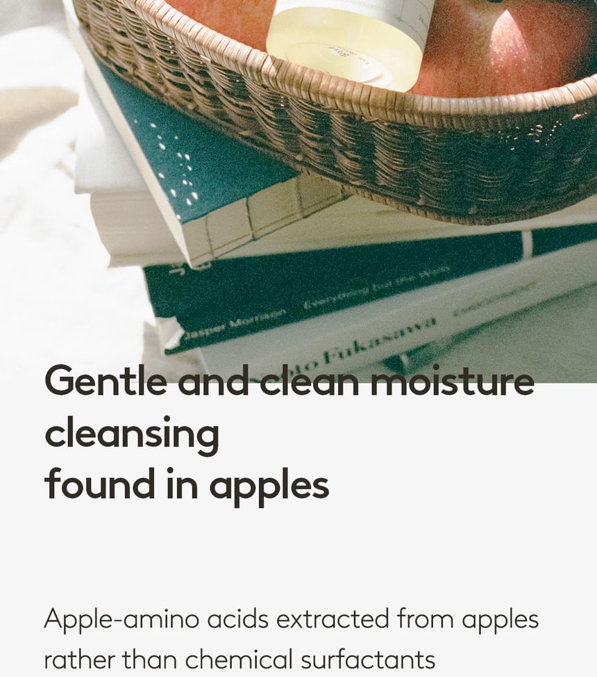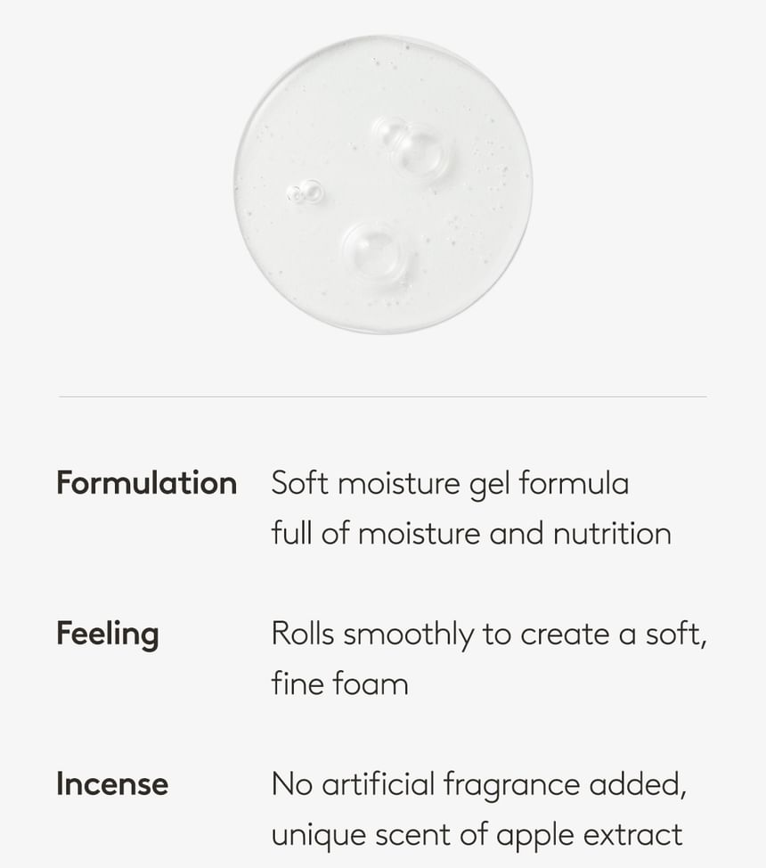 • This gel cleanser is formulated with eight types of hyaluronic acid and six types of plant-based oil to remove impurities and grime while replenishing moisture. Thanks to the apple extract in the formula, the gel cleanser features a refreshing fruity scent.