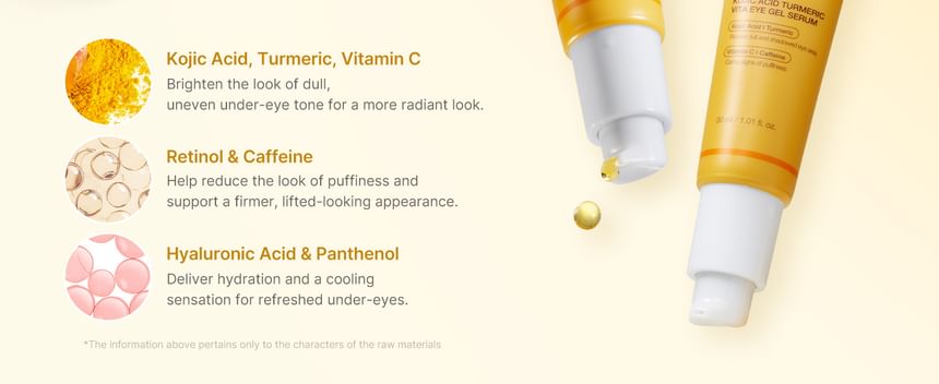 Kojic Acid & Turmeric: Brightens dark circles and evens skin tone.