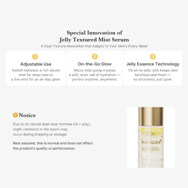 Powered by Kojic Acid and Turmeric to help refine uneven tone and texture, fade the look of dark spots, and soothe troubled skin. Formulated with an optimal 1:9 oil-to-jelly ratio to keep ingredients potent and skin luminous — no stickiness, just lasting hydration and glow. Micro-mist pump creates a soft, even veil of hydration — perfect anytime, anywhere.