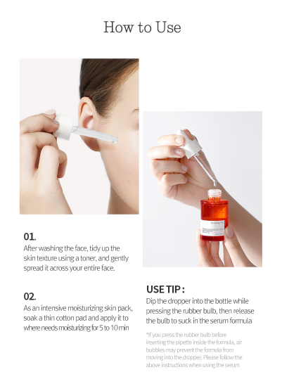 After toning, use the dropper to dispense an appropriate amount and gently apply over the face. Lightly pat until fully absorbed. Tip: When using the dropper, squeeze the rubber top before placing it into the bottle, then release to fill the pipette easily.