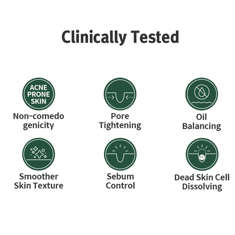 Clinically verified results Toner • Pore area reduced by 60.7% • Oil reduced by 34.4% • Sebum reduced by 32.7% • Dead skin cells reduced by 26.9% • Skin texture improved by 17.2% Serum • Papules reduced by 69.5% • Oil reduced by 27.8% • Sebum area reduced by 26.7% • Improved skin barrier condition Cream • Dead skin cells reduced by 44.3% • Oil reduced by 14.9% • Pore size reduced by 37.5% • 24-hour hydration retention Vegan and cruelty-free with EWG Green Grade ingredients. Dermatologist-tested in Korea and clinically certified as non-irritating, making it suitable even for sensitive or acne-prone skin.